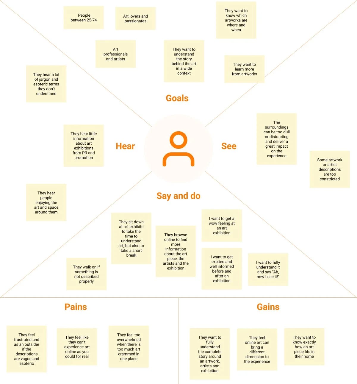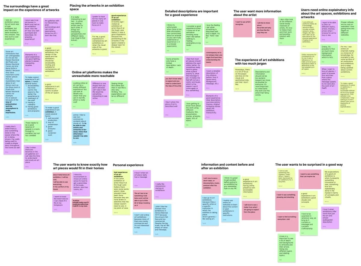 We want to learn more about the needs, problems, and perspectives of the user. In order to do that we chose to do qualitative research in the form of user interviews. We created a user interview guide and started interviewing 5 different people varying from art lovers to art professionals with ages between 28–69. Having gathered a lot of useful information, here are a couple of the User’s Quotes that sum it up quite nicely: