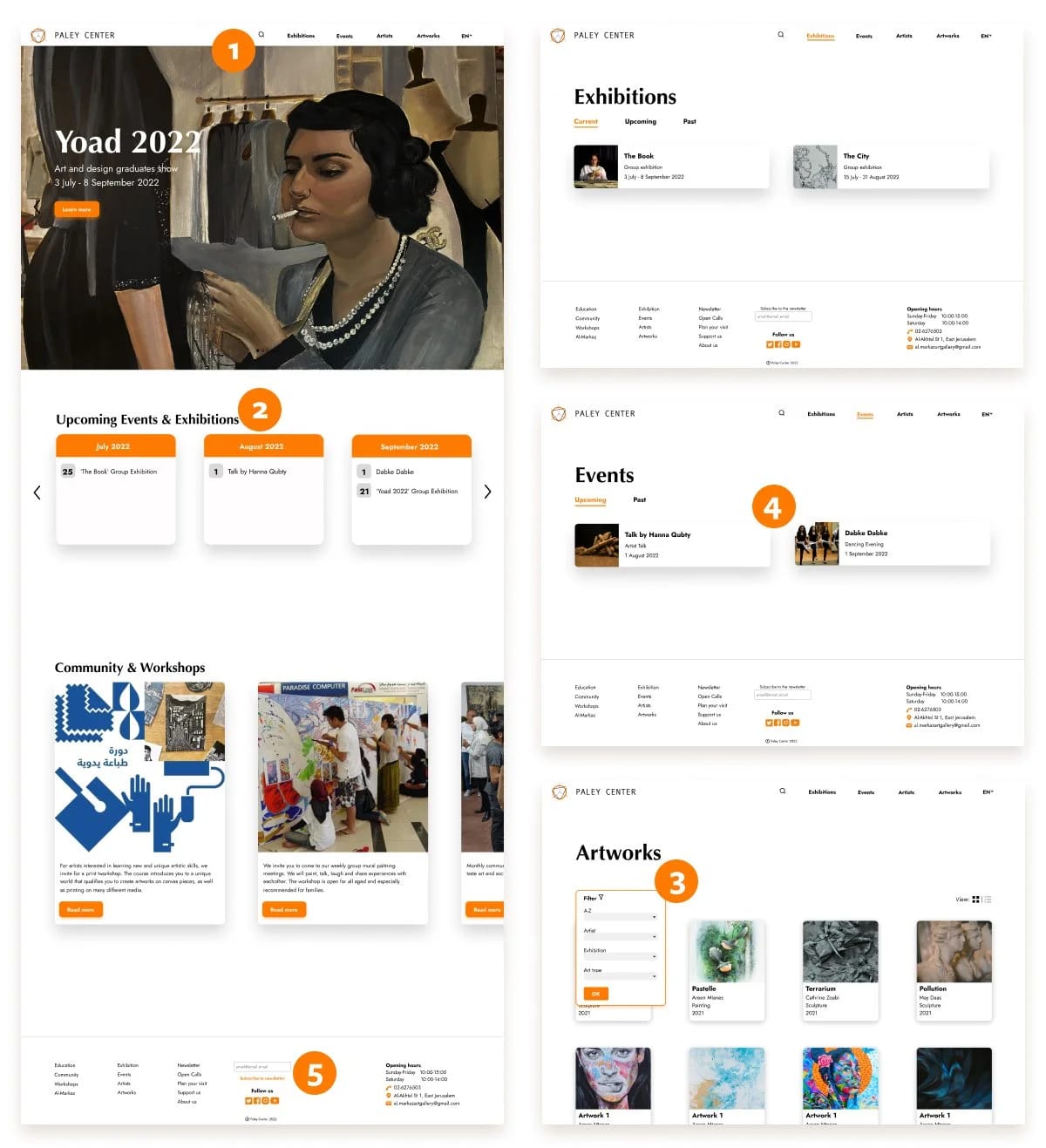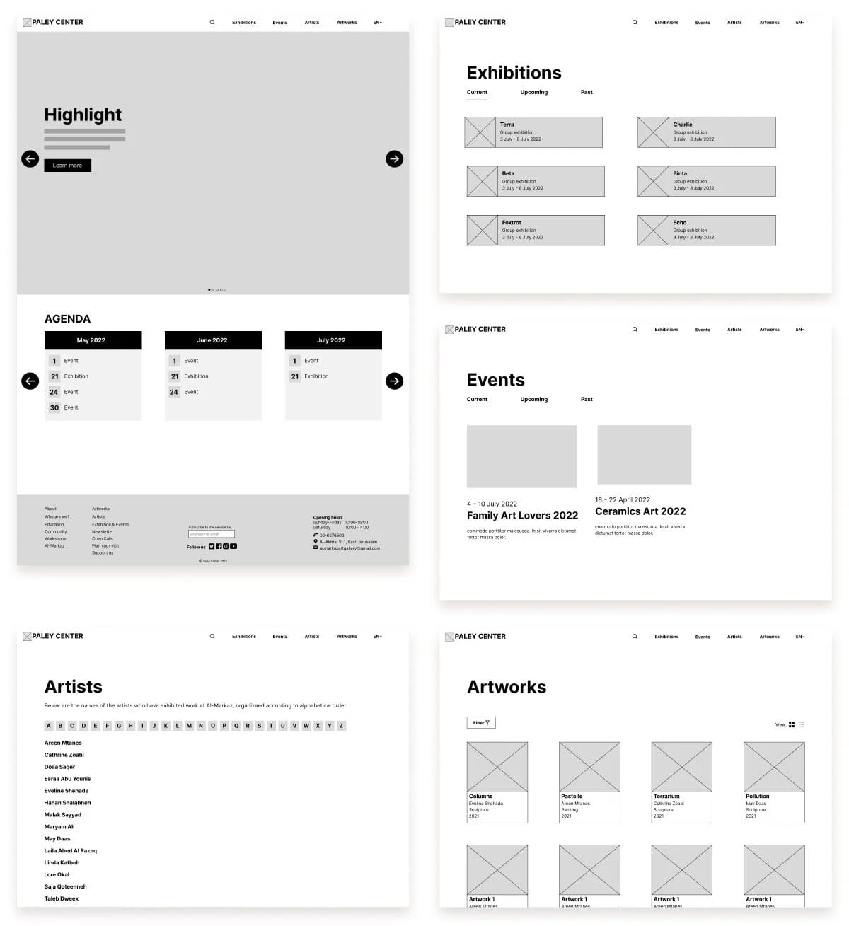 The goal of this website, at the bare minimum, is to provide an accessible platform with information about art exhibitions, artworks and artists for visitors of The Paley Center, in Arabic and English. By offering detailed content about the artworks, exhibitions and artists, the website further aims to improve the experience of the visitors of The Paley Center and bridge the gap between the contemporary artists and the community.