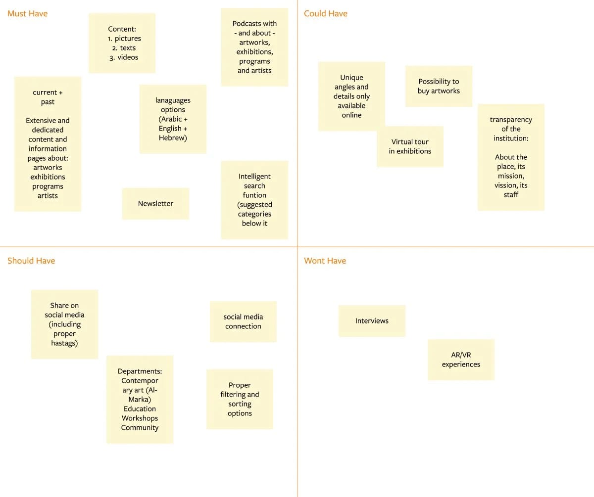 Next, we converged these options into choices by discussing what is best for Meryam. To help us further prioritize these solutions we additionally applied the MoSCoW-method. This helped us to write a final minimum viable product statement (MVP):