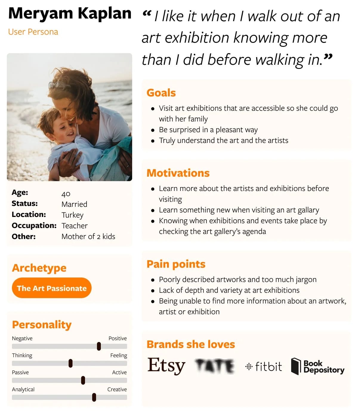 Having synthesized who our user is, all these insights are put together in one primary user persona. This persona will help us during the rest of the design phase. We’d be able to ask at every step: “How is this improving Meryam’s experience?”